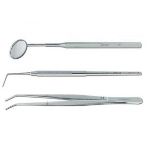Le kit contient : 1 précelle « London College » + 1 sonde n° 6 + 1 manche de miroir avec miroir plan n° 4.